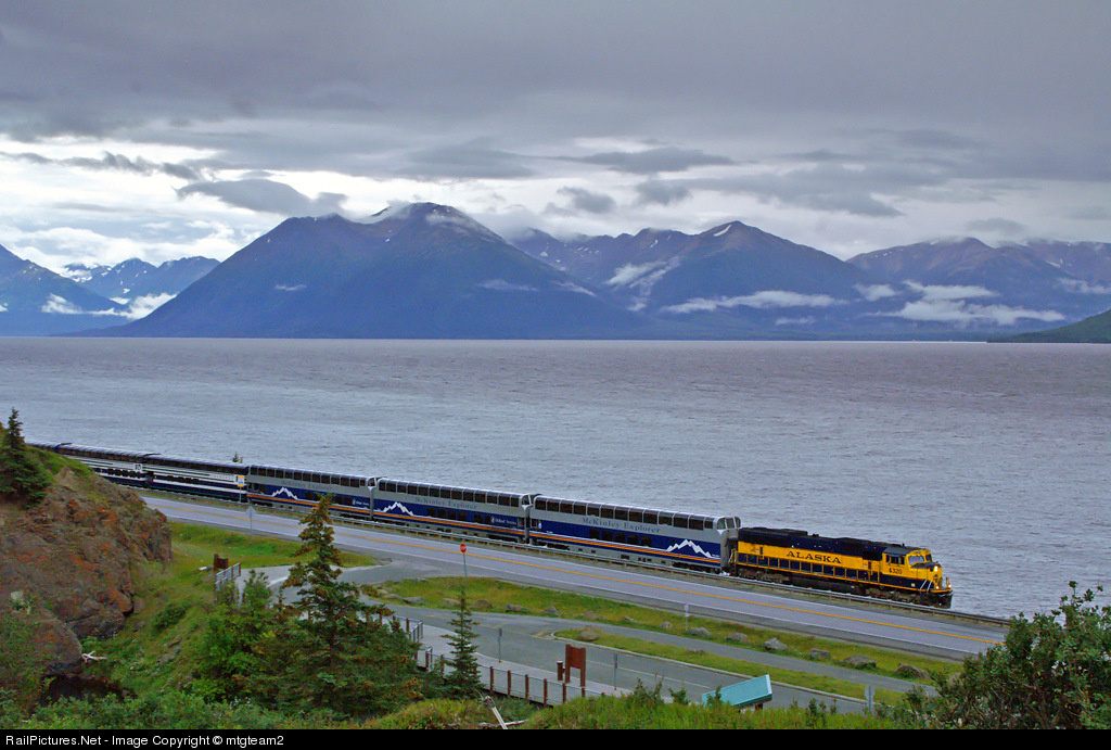 | The Denali Explorer hugs the coatline of Turnagain Arm enroute to Denali Park Station. From this location you can hike to a number of different overlooks of the Alaska Railroad and Turnagain Arm. Of course beware of bears, I had an encounter with a sow and her cub and while I wasn't in any real danger I was a bit nervous. |