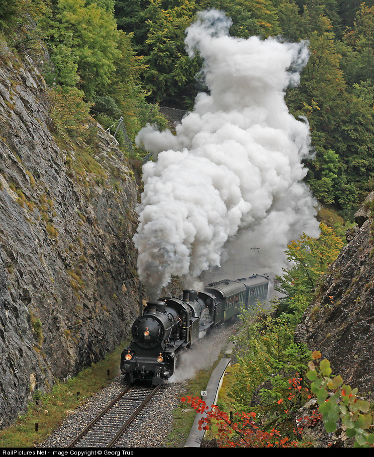 | "Elephant" C 5/6 2978 and express train locomotive A 3/5 705 with a 8 car train for the celebration of 150 years of the line Neuchâtel-Pontarlier in the gorge near the Areuse river source on a grade of 2.4 %. The train just left St-Sulpice tunnel and will soon enter the Haut-de-la-Tour tunnel. |