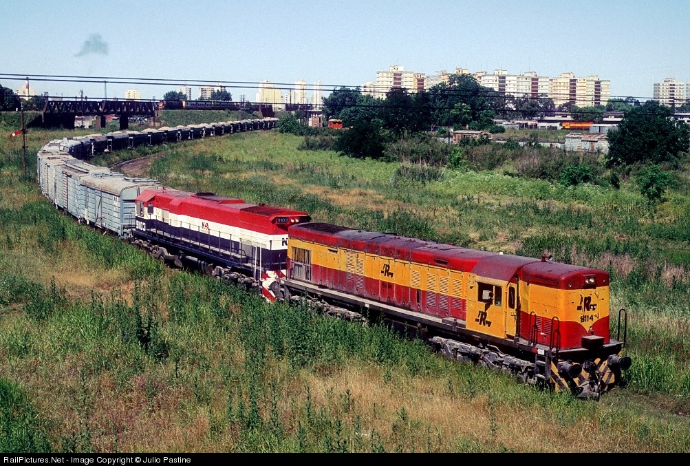 Ferrosur Roca's General Electric export-model U18C #8114 helps disabled Nuevo Central Argentino's GM-EMD GT22 #9103 to complete her run into Kilo. 5 Yard, in the southern surroundings of Buenos Aires. The G.E. unit shows Ferrocarriles Argentinos' former paint scheme of red and yellow, slightly modified by Ferrosur Roca with cab sides in yellow. For those interested in the "before" and "after" appearances of these G.E. units once the Brian McGuinty's overhauls were completed, just compare this view of #8114 (which was never turned into the ovehaul program) with my image (Rail Pictures number 330052) of sister unit #8121, the first to be done.