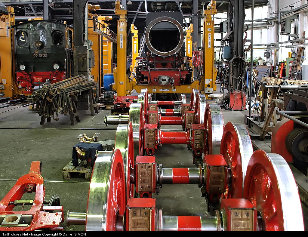 | The HSB 99 7232 is undergoing some reparations in the Wernigerode Westerntor workshop. The locomotive has got a brand new smokebox. The profiles of the complete wheelset has also been turned. Please note that the third (middle) drive axle has no flange. The bearings of all the other drive axles can be moved axially by approximately 5 cm on each side. This is required so that these narrow gauge monsters can easily negociate the tight curves on the HSB system. Three other steamers were also present in the workshop that day. The 99 7238 and the Mallets 99 5902 and 99 5906. |