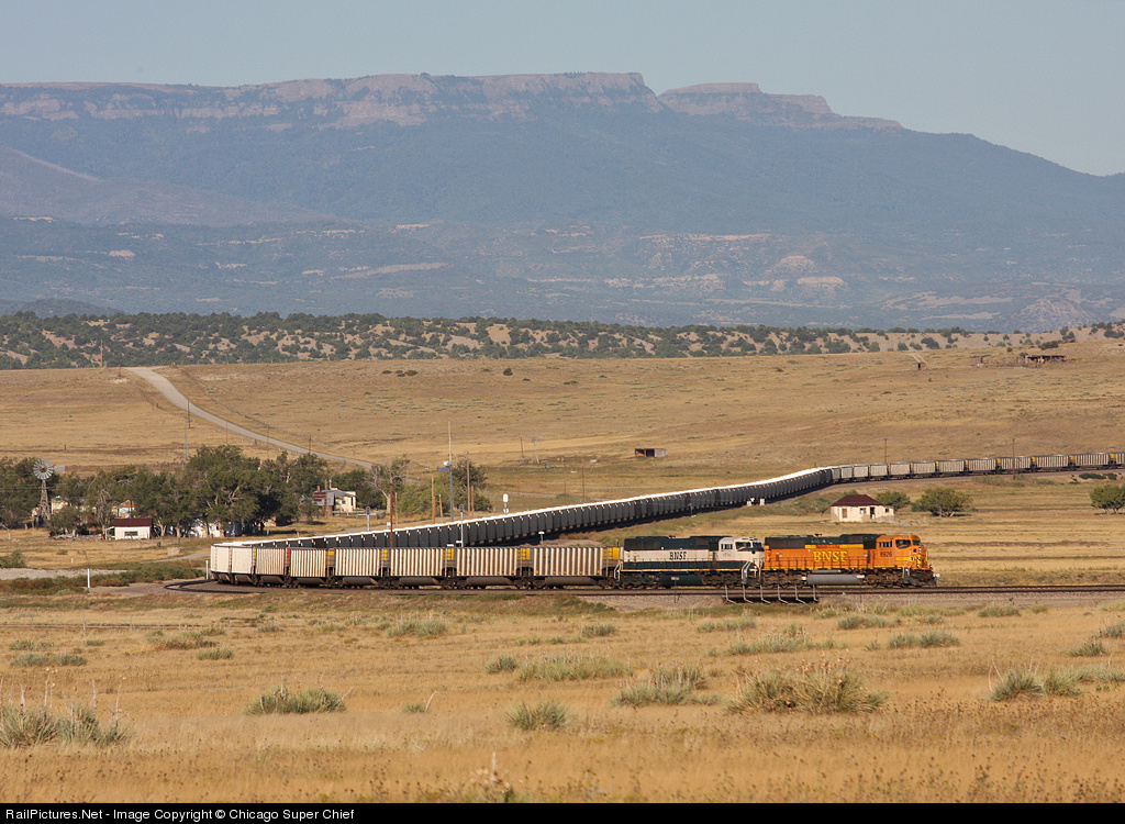 DPUs at the back of coal empties bound for Wyoming are having no problem holding up the back of the train, as this train rolls by the quiet, lightly-populated ranching town of Trinchera, Colorado. Though this is a north/west bound directional running line (with south/east trains running on the old ATSF from Pueblo through La Junta to the north), there is still a siding here, and the line is still signaled for running both ways. Trinchera, the town, still has the old Colorado & Southern depot (although it's moved a block or two from the tracks).