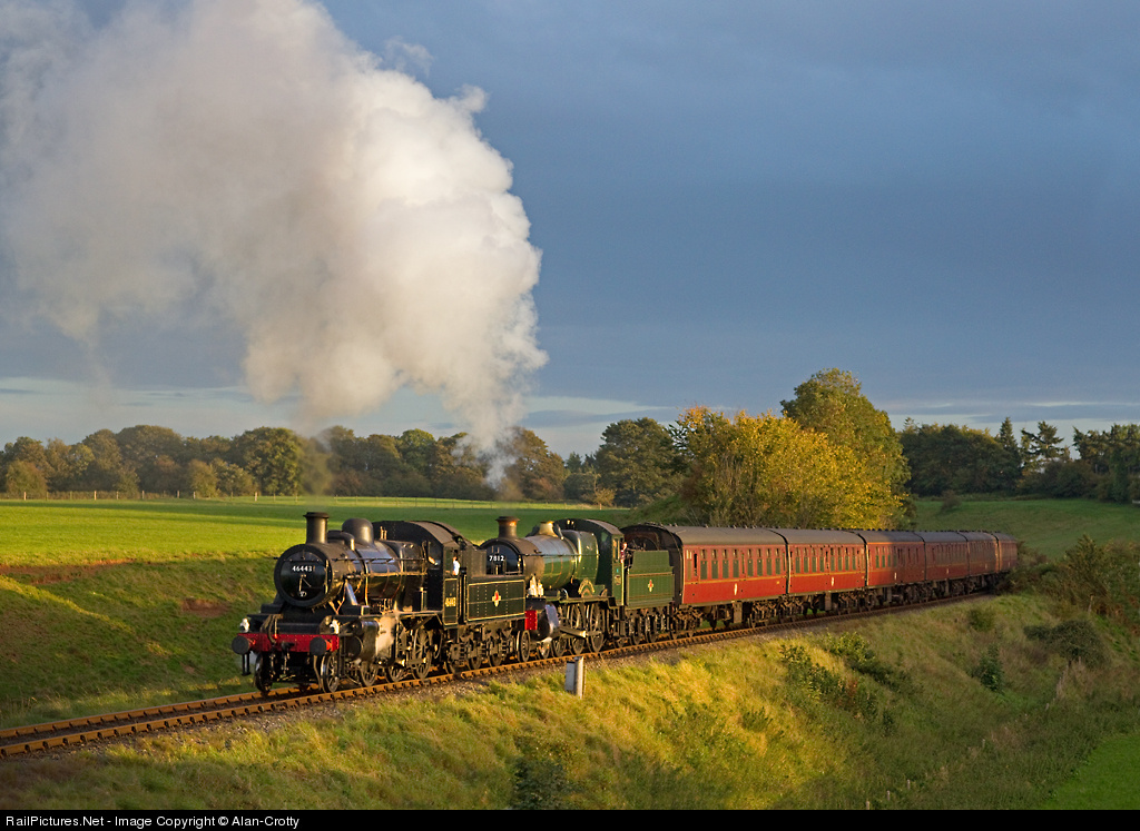 | The Severn Valley Railway runs through great scenery in the West Midlands of UK. It is home to about 30 steam locomotives from fallen flag railways, GWR, LMS, SR and BR. Here we see former LMS mogul 46443 piloting an ex GWR 4-6-0, named Erlestoke Manor just catching the very last light of day as they work up Eardington Bank towards Bridgenorth. |