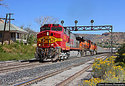 A clean BNSF Railway C44-9W in classic 'warbonnet' livery leads a Union Pacific Savage coal train through the Red Narrows of Spanish Fork Canyon approaching Rio, Utah.