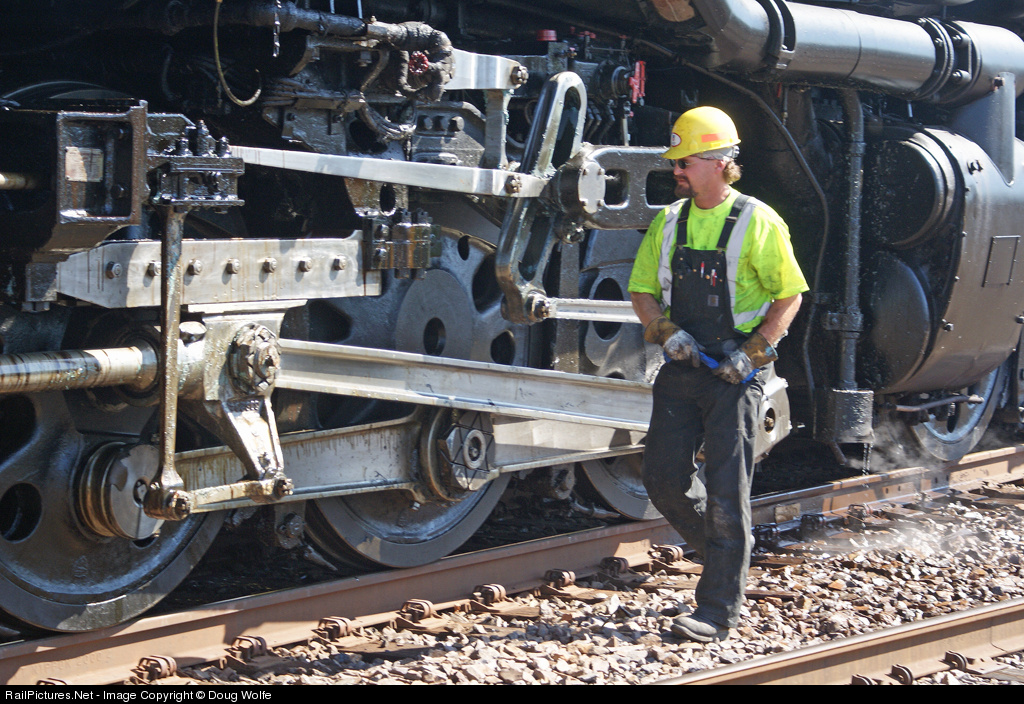 The monster wheel & connecting rod assembly on steam locomotive UP 3985 are inspected multiple times during a service stop in Southern Illinois.