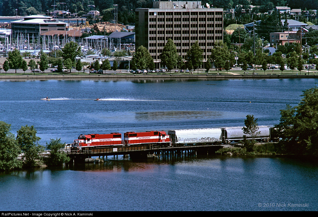 It's The Water! It's downtown Olympia on a warm mid-summer Friday and Tacoma Rail's "Belmore" Local crosses Capitol Lake on it's way to work industry in Tummwater's Mottman Industrial Park. This is the former Northern Pacific's Grays Harbor Line (16'th Subdivision) between St. Clair, Wa and the Pacific at Moclips, WA. But what's that? Yes, it outboard racing time! On the weekend prior to Olympia's Lakefair, the Seattle Outboard Association conducts regatta racing on the reflecting lake at the base of the Deschutes River (that waterfall on the Olympia Beer Label). Incidentally, "the water" is currently infested with New Zealand mudsnails, restricting fishing and boating. Scanned From Transparency:Fuji RDP III