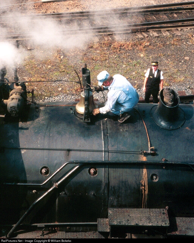 Locomotive crew member was polishing the locomotive bell prior to the train moving to the passenger platform as the train's conductor looks on.