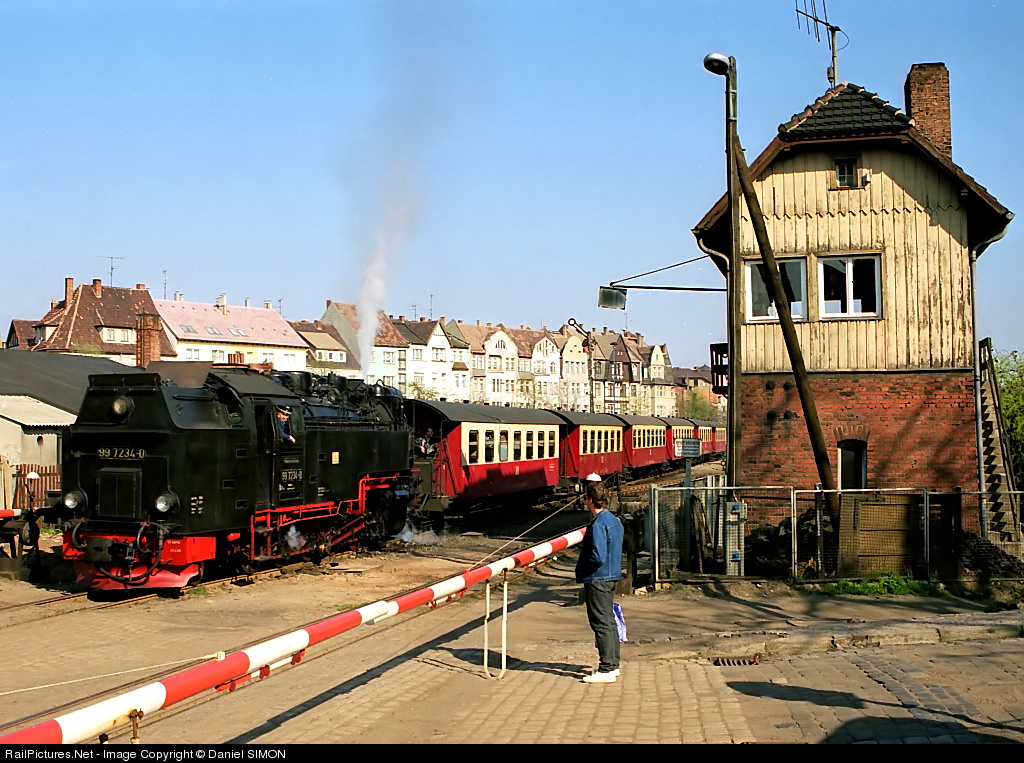 | The 99 7234 is leaving Nordhausen tender first. Today, only one steam train is departing from this station. Most of the HSB steam activity is now located at the other end of the Harzquerbahn at Wernigerode. |