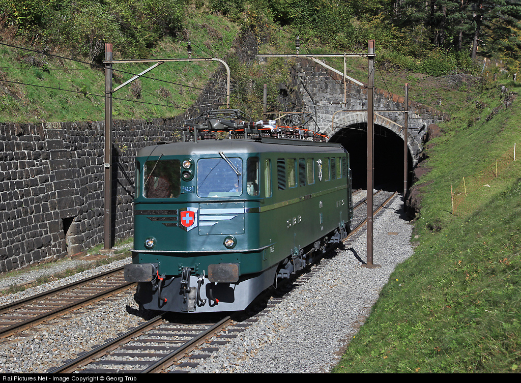 | Ae 6/6 11421 "Graubünden/Grischun" of SBB Historic, on loan to "Verein Erhalt historische Elektrolokomotive Ae 6/6" and based in Biasca (EVU is Club del San Gottardo Mendrisio), on the Gotthard line above Wassen, leaving upper Entschigtal avalanche gallery. |