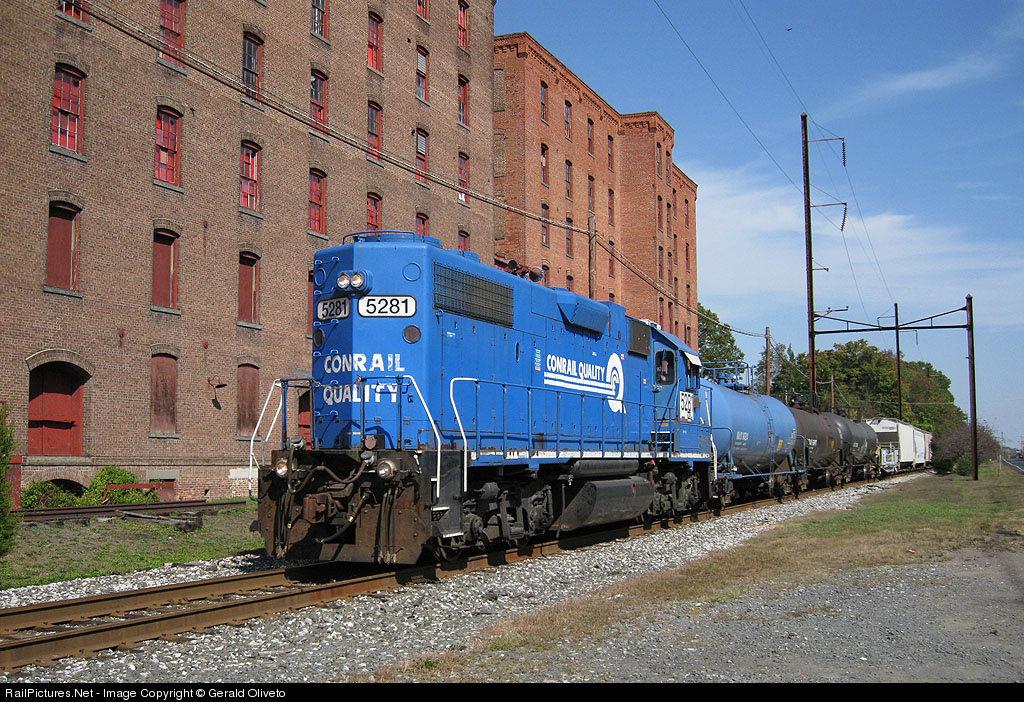| Norfolk Southern GP38-2 no. 5281 passes the abandoned Helme Snuff Mill in Helmetta on Columbus Day 2010. The Conrail locomotive and the Mill itself are both on borrowed time. Abandoned since 1993, the historic Mill is slated to be demolished and replaced with a downtown area and shopping complex. Conrail blue is also an increasingly more scarce sight, but may outlive the Snuff Mill. |