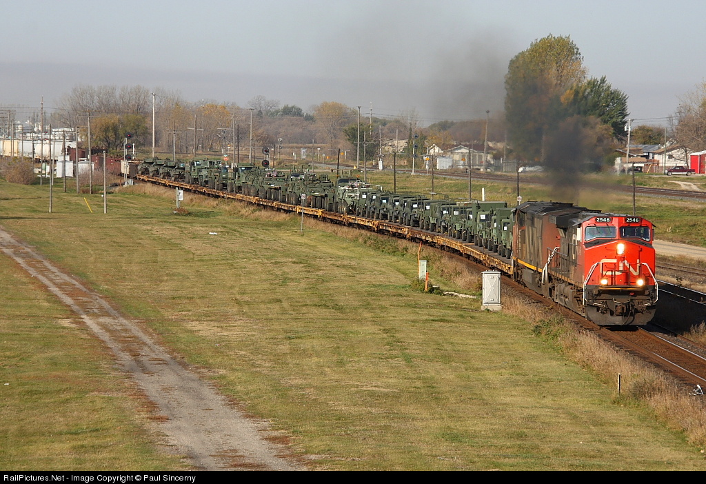 The head end of Q114 contains a variety of Canadian military equipment being shipped from the training center in Alberta to bases in eastern Canada.
