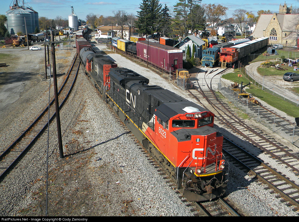 | A pair of CN EMD's bring 184 into Bellevue, grinding through the Mad River Connection and passing the miscellaneous wonders at the Mad River & Nickel Plate Railroad Museum. |