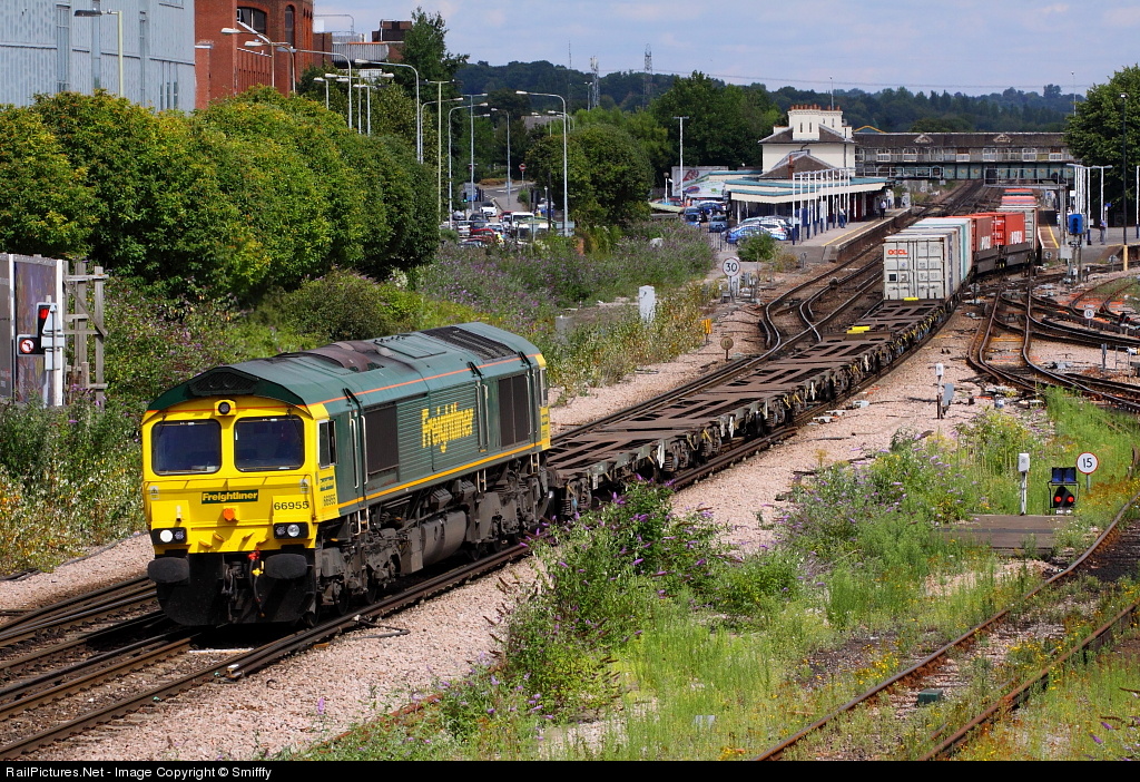 | 66955 eases across the point work at Eastleigh after a brief stop for a driver change. The container terminal at Southampton is now only a few miles away. |