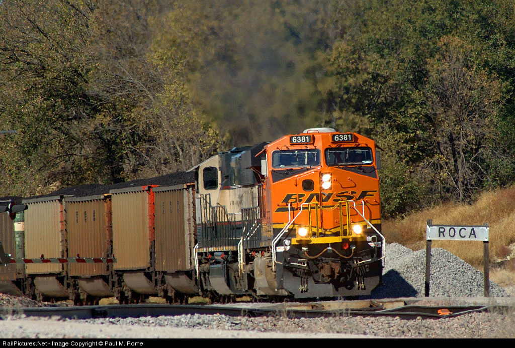 | BNSF 6381 and 9602 work a loaded coal train southbound through the curves at Roca Nebraska. |