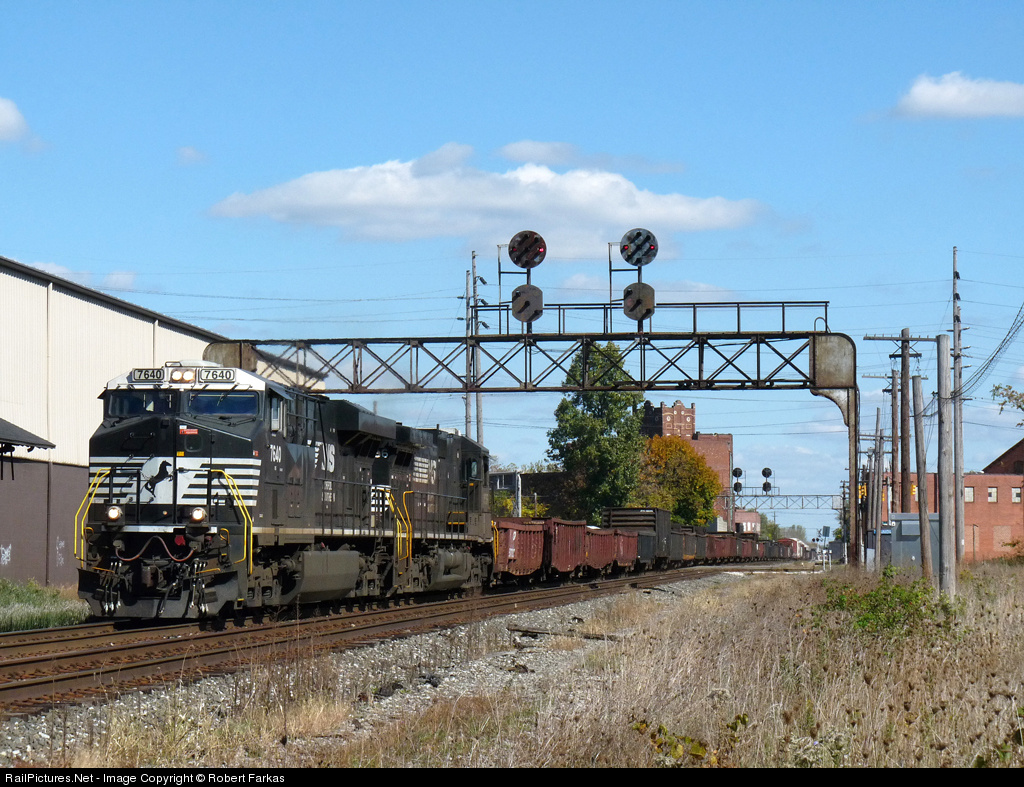 Westbound NS 7640 and a sister locomotive pass through a scene filled with railroad history. Starting from the left there is a small triangle which is part of the roof over the loading doors of the ex-PRR freight station. Next comes the eastbound ex-PRR signal bridge and further back the westbound ex-PRR signal bridge. Between the two signal bridges runs the Wheeling and Lake Erie's crossing of the NS line; this crossing is referred to as WANDLE and at one time had a tower. Finally, to the right is a pole line just like so many from the golden days of steam.