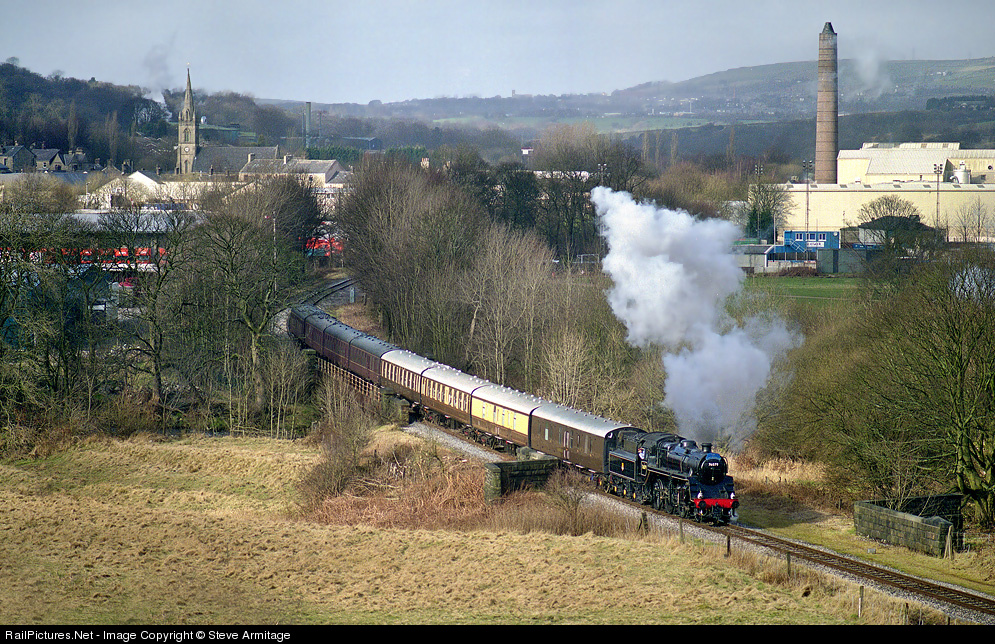 The Lancashire town of Ramsbottom, with a population of just under 15,000, is the mid-point of the East Lancashire Railway. Dominant in this landscape is the stone-built church of St. Paul in the Early English style, erected in 1850 at a cost of £3,400. Getting under way from Ramsbottom station (just out of sight behind the trees) and heading towards Bury is BR 'Standard' Mogul No.76079 a stalwart of the line's fleet. This locomotive is very much in demand for main line running all over the UK, usually paired with 'Black 5' 4-6-0 No 45407.