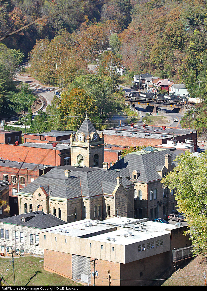 Taken from the town overlook along the bypass, 17M passes through downtown Welch and past the McDowell Co. Courthouse as some railfans shoot from trackside.