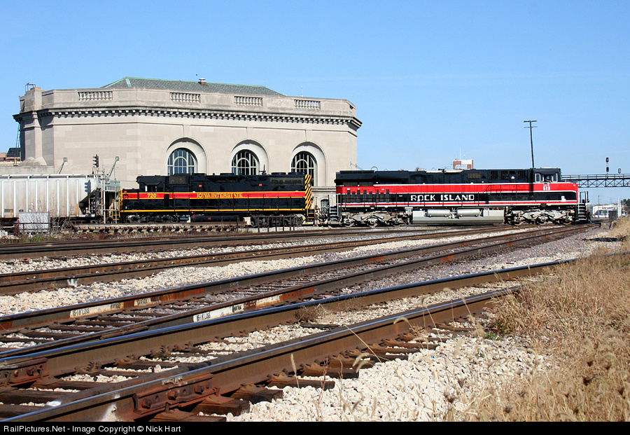 Iowa Interstate ES44AC 513, the Rock Island heritage unit, passes the 1912-built Joliet Union Station, crossing the BNSF, CN and UP diamonds and running down the old Rock Island main.