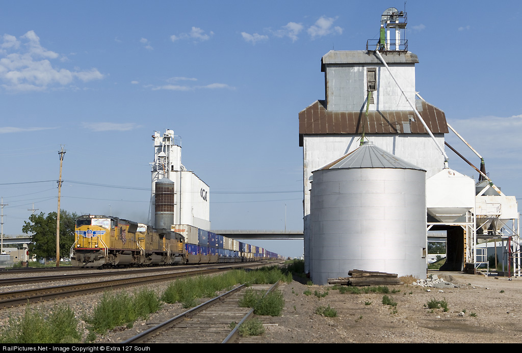 A westbound UP double stack train splits the grain elevators at Cozad, NE.