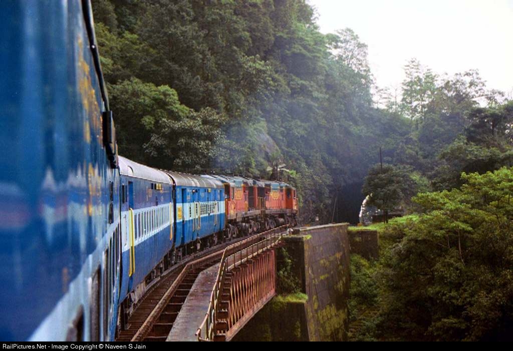 | A view of the back of the train as it crosses the bridge over Doodhsagar (Sea of milk) waterfalls on Briganza Ghats, Goa, India |