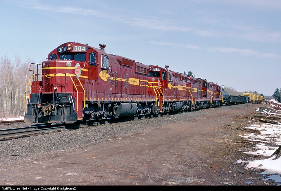 A scan of a slide from 1989. Several rebuilt SD9s haul a rare freight on the DMIR I believe somewhere around Saunders? Corrections welcomed.