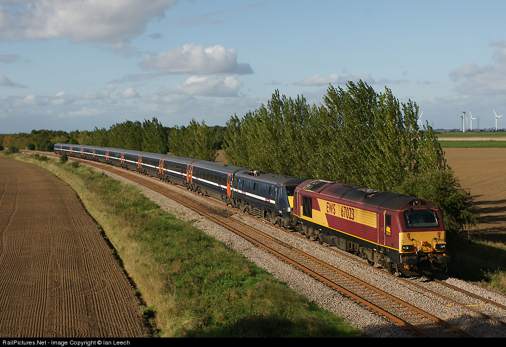 | With the East Coast Mainline closed between Peterborough & Newark.Trains were diverted via Spalding & Sleaford on old Great Northern & Great Eastern Joint line.Here 67023 hauls 91103 & its train on the approach to Donington on the 12:05 Leeds to London Kings Cross. |