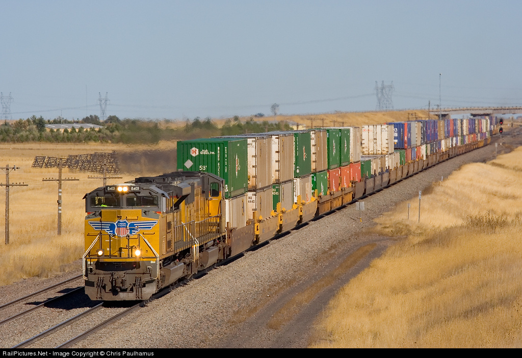 Stacks roll west toward Cheyenne behind an EMD duo. Kudos to UP for fronting non-coal trains with ACes!