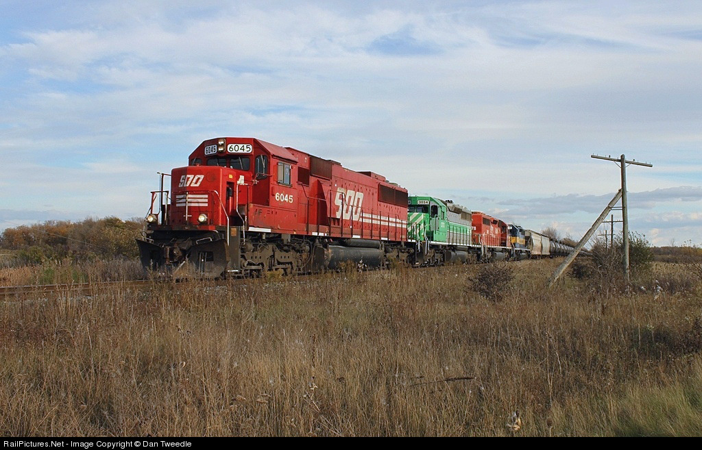 | CP 627 hauls ethanol empties down the Hamilton Sub with a colourful lash-up including Soo Line, CITX, DM&E, and IC&E. |