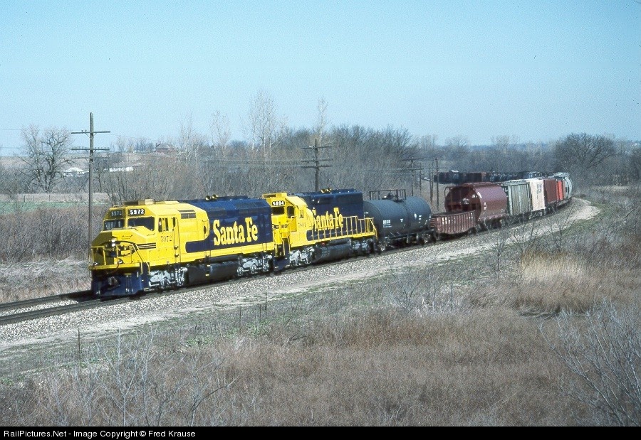 Disregard the SP/SD-9 info... I hit the wrong key and accidently uploaded this pic before I had changed all of the info from my previous pic. DOH!! While commen on the Santa Fe, how many other Class One's could put together an F-45/SD45-2 lash-up like this? NONE!. Freshly shopped and painted 5972 and 5804 lead a wesbound through Shawnee, Kansas on a beautiful spring day.