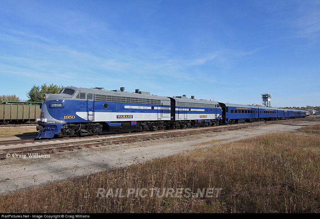 | Central States Dinner Train bound for Columbia, MO, is parked at Oelwein waiting for shipment south. The crew got the train out for display and photos today. The train is painted in an inspired Wabash paint scheme. The train should be leaving Oelwein here in the next few weeks. |