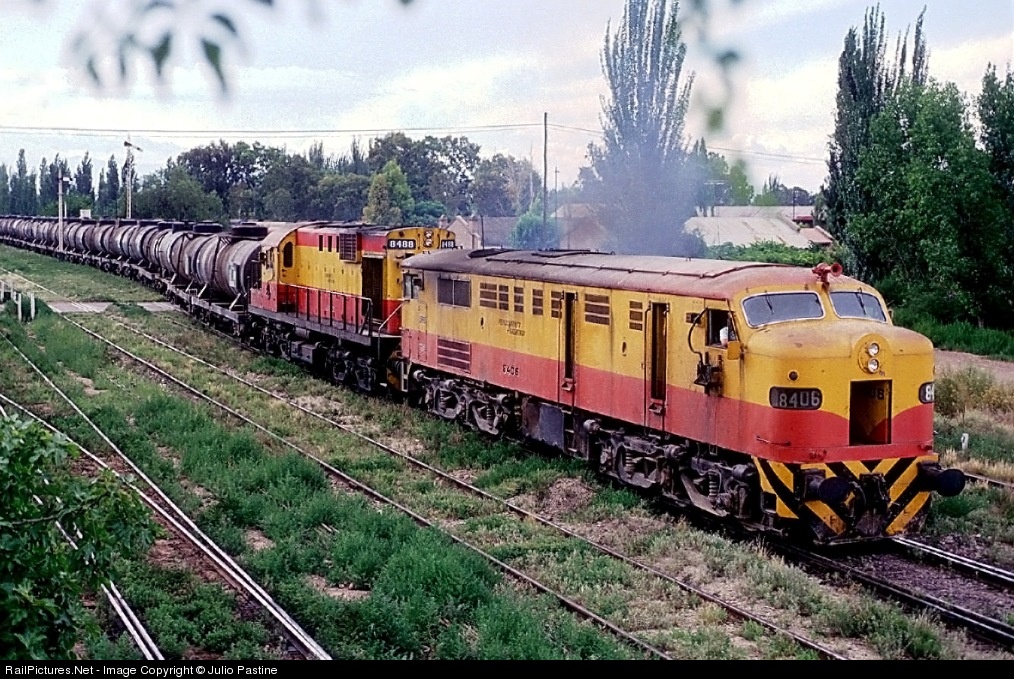 ALCo.-MLW FPD7 #8406 pulls away from the Palmira Yard with an empty train of oil tank cars and trailing dead-in-tow ALCo. RSD16 #8488, entering the eastbound (down) main of the double track mainline of the General San Martín Railroad between Buenos Aires and Mendoza. Train will travel east to José N. Lencinas, then will turn south to reach Monte Comán and the branch to the oil loading facilities at Malargue, in the southern part of the Province of Mendoza.