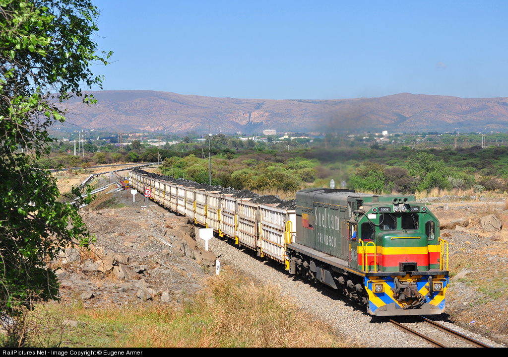 | With 20 loaded hoppers in tow, ex- Sheltam C30 no.3008 marches up the grade through Paardekraal cutting on the Rustenburg Platinum Mines main line, heading to Waterval Plant. The town of Rustenburg and the Magaliesburg mountains form the backdrop to this scene that is repeated many times each day. |