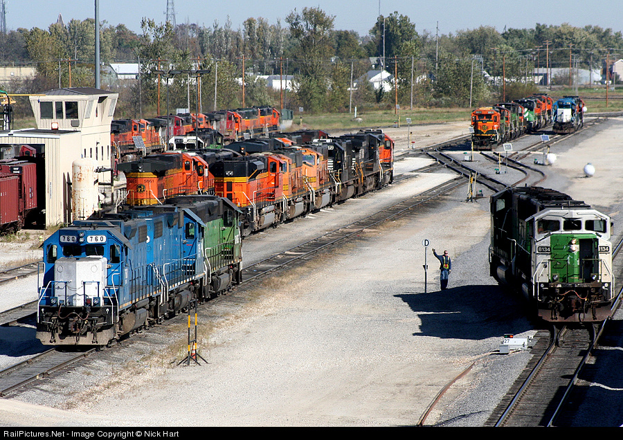 "8134, that'll do." The conductor sends out a signal to the engineer of one of the recently, reactivated SD60M's on the BNSF system, while other units carry on, in the Galesburg Yard.