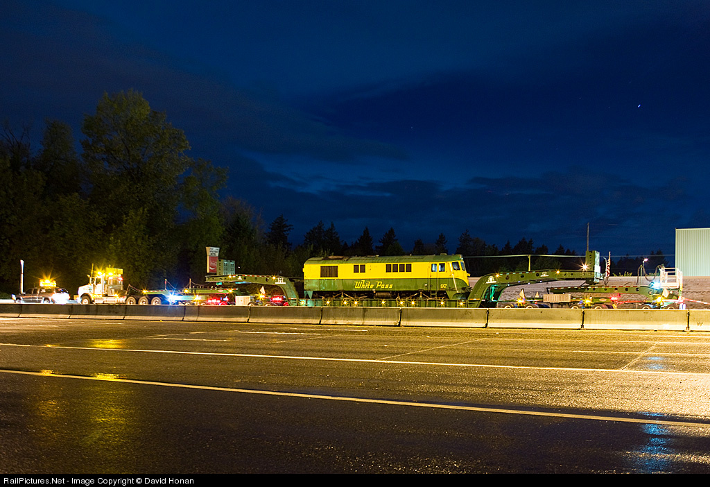 Well, that was unexpected: Driving up I-5 in the wee hours of this morning after the Autumn Leaf Slide Show in Centralia wrapped up, I was intrigued by a collection of flashing lights on the southbound shoulder... and then thoroughly shocked to find White Pass & Yukon Route #97 perched on a massive heavy-duty flatbed trailer. The engine was being moved to Global Locomotive near Olympia for rebuilding with a Cummins power plant as part of the railroad's modernization program. This photo was taken from the shoulder of the northbound Bridgeport Way off-ramp as there were no other safe places to get a view of the stopped procession.
