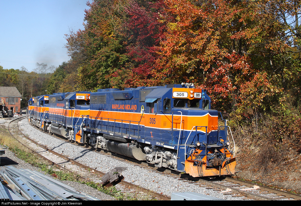 Five of the six Maryland Midland GP38s bring the UBEG into the CSX interchange at Emory Grove, MD. Today's train was a big one with 44 loaded cement hoppers from the Lehigh Cement Plant in Union Grove and a couple of box cars picked up in New Windsor.