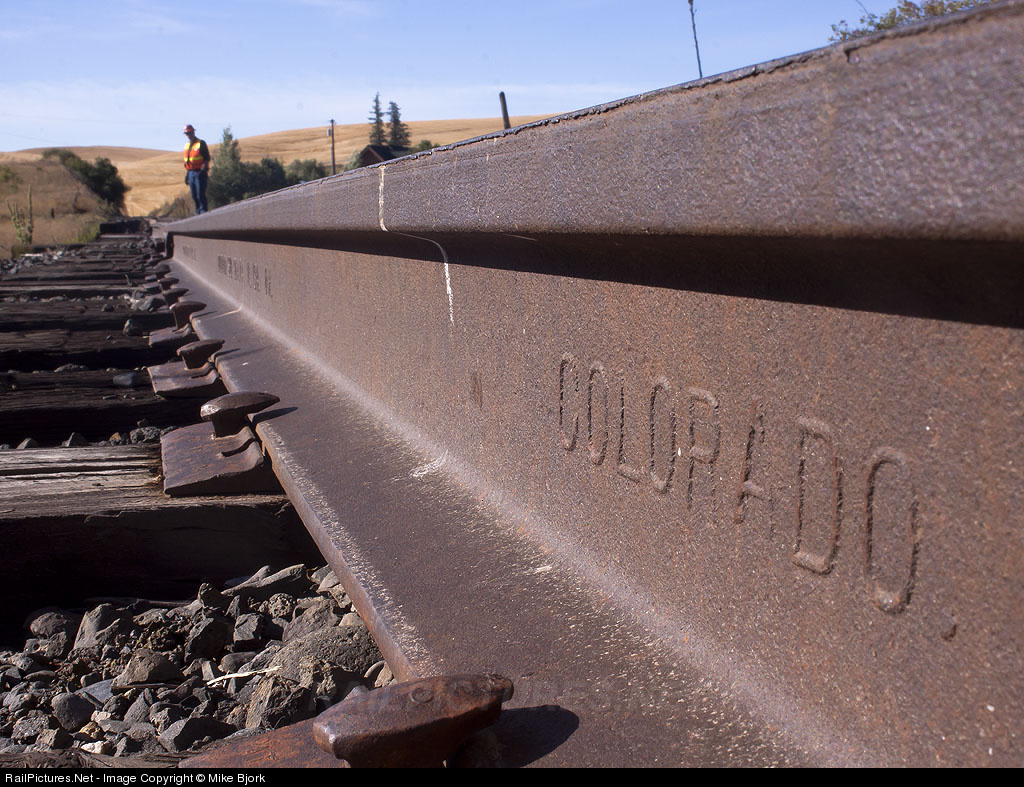 | What was suppose to be a work photo ended up being a nice shot looking down some old Colorado iron. Frank stands along a sag in the bridge. The photograph is intended to show the severity of the dip in the line and where it falls upon the bridge. Sadly, I did not get the year the rail was rolled, but I think it was sometime in the 1930's. Most of the date nails in the area were from the 30's. |