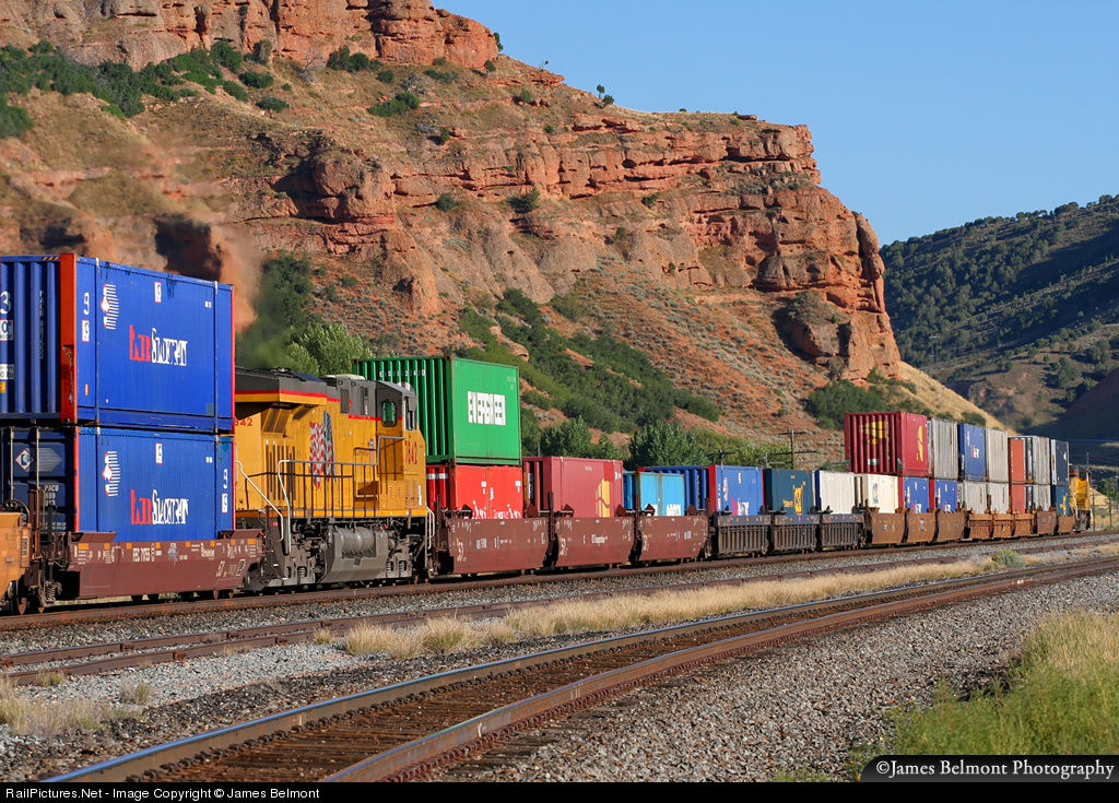 A pair of GE ES44AC's team up to propel Union Pacific's Lathrop, CA to Global 4, IL stack train east through Echo, Utah. This pair of late model GEVO's are separated by 14 container platforms. A third GEVO (UP 5431) is shoving on the rear of the train.
