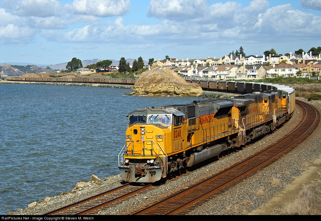 | Nine thousand nine hundred and ninety two tons of hoppers loaded with iron ore for export head West behind UP 8248 and two yellow sisters, rounding the curves of the San Pablo Bay, on UP's Martinez Subdivision which is known as the "Cal-P". |