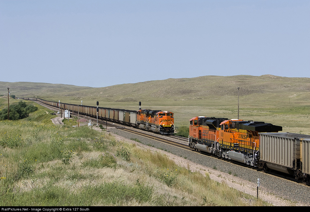 An eastbound BNSF unit coal train meets a westbound empty unit coal train near Bingham, NE.
