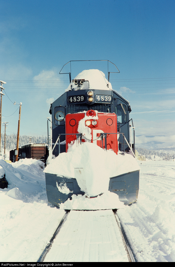With icecicle breaker raised and wire grill on windshields over nose, SP GP38-2 4839 rests between Flanger runs over Donner Pass at Truckee, CA on January 4, 1987.
