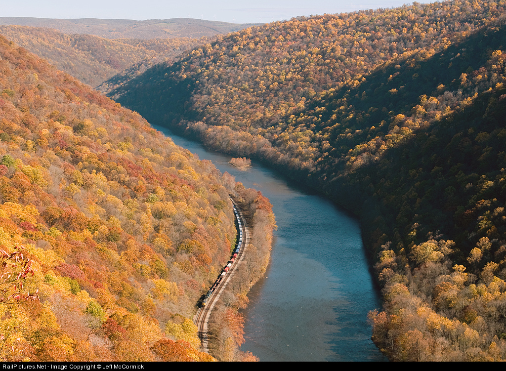 | With oak and sassafras leaves still clinging to the trees on this beautiful fall afternoon, a westbound train runs along the Youghiogheny River at Chestnut Ridge. In the distance you can barely see wind turbines lined along Laurel Ridge a good eight to ten miles away. |
