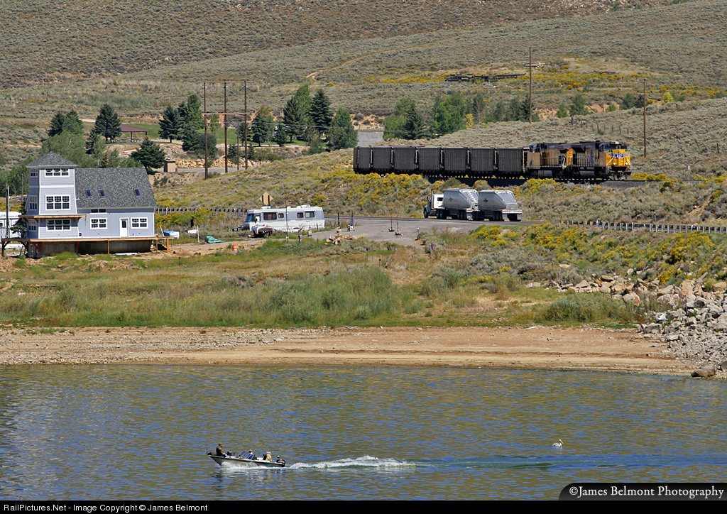 Union Pacific's Valmy, NV to Skyline, UT coal empty heads east up the Pleasant Valley Subdivision at milepost 11 along Scofield Reservoir. It was a great day to be outside fishing and following trains along this obscure branchline in rural Carbon County, Utah.
