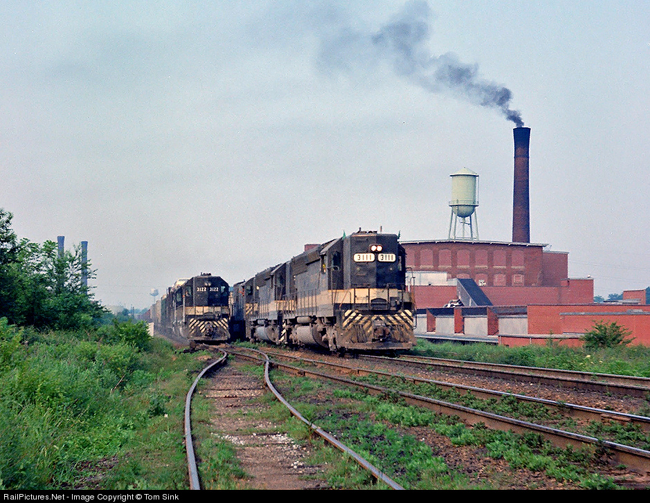 Southbound Southern Rwy train #153 passing a stopped merchandise train south of Greenville, SC in this May 1969 scene with a Cone Mills plant in the background.