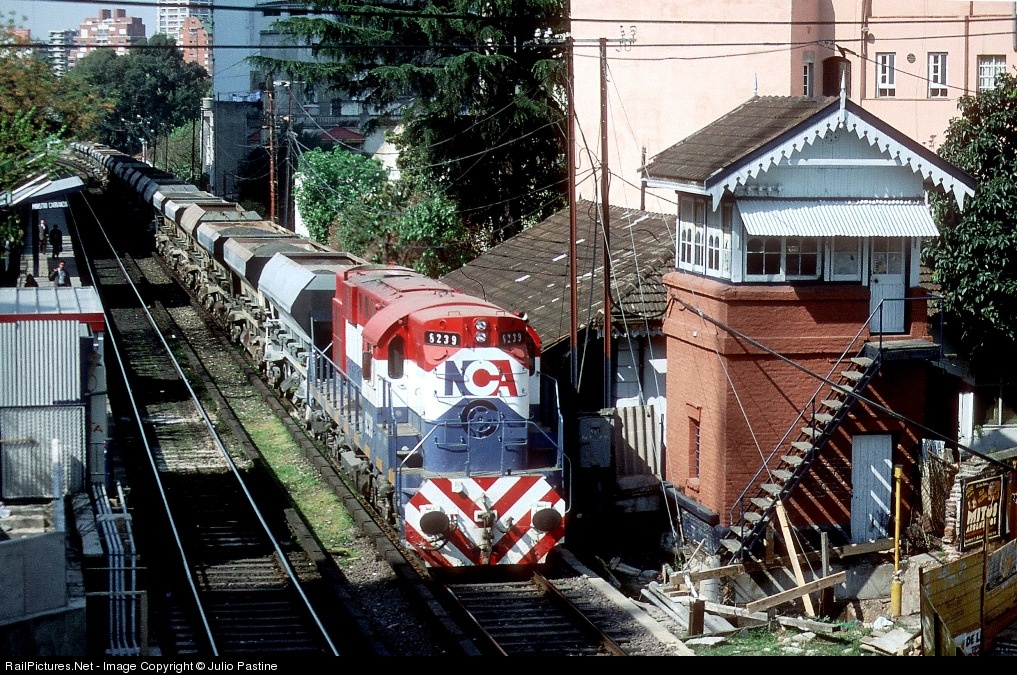 Nuevo Central Argentino Railroad's ALCo. RSD16 #8239 heads a train of empty hopper cars through the suburban station of Ministro Carranza, a mere 7 kilometers away from the Retiro Terminal. The tower at right, long ago out of service, managed signals of the double track ex-General Mitre mainline and the manual gates of the former grade crossing of the Santa Fe Avenue, by then converted into a subgrade passageway. Two reasons have turned this scene impossible to be duplicated nowadays: the footbridge from which this picture was taken was a temporary structure dismantled as soon as the works of the subgrade passageway were completed, and the huge pine tree just over the locomotive fell down to the tracks during a rainstorm in the Fall season of year 2000.