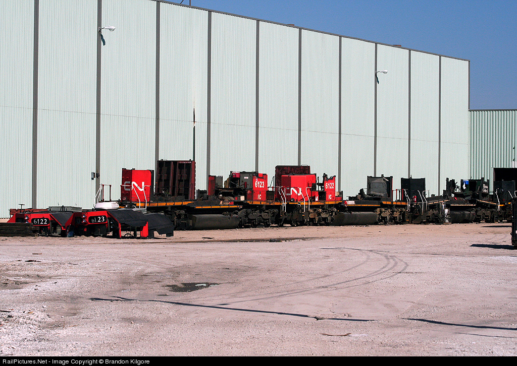 This is where a lot of locomotives go to die on the Canadian National. Former IC SD40-2's getting scrapped at the former IC Woodcrest Shop, notice the frames cut in three pieces completely destroying these units. CN is doing a good job at reducing the deadlines around the shop complex...(IC 6123, IC 6122, IC 6013 & IC 6068).