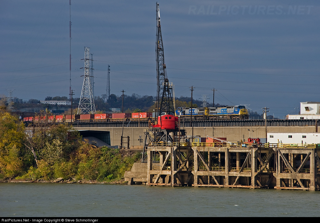 A CSX intermodal train switches along the Ohio River at the south end of Queensgate Yard.