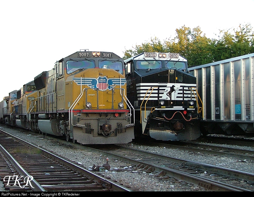 UP 5087 at the point of a westbound intermodal joins NS9810 at Tower 17 to wait for UP crews to take them west.