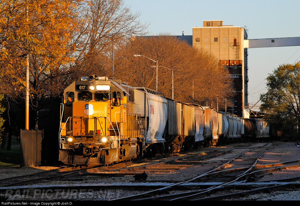 | UP 617 glimmers in the final rays of an Autumn sun as it heads back for the yard. While switching River and Rail, 01 put 4 on the ground, so they could only take these 17 cars back with them. |
