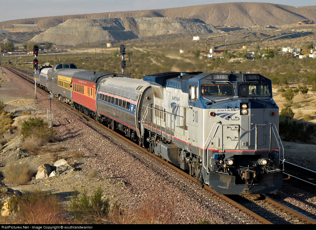 | Returning from a rare mileage trip to Kelso on the Union Pacific's LA&SL route, Amtrak Dash 8 #510 has the Kelso Flyer well in hand as it sprints across the high desert near Victorville on the trip back to LAUPT. |