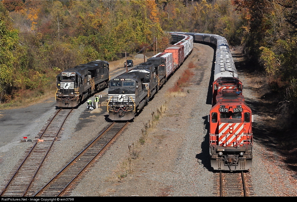 CP hands over the RBBB circus train to the NS. The CP power will cut off and go to Enola Yard while the NS power at the far left will couple on and take the train west.