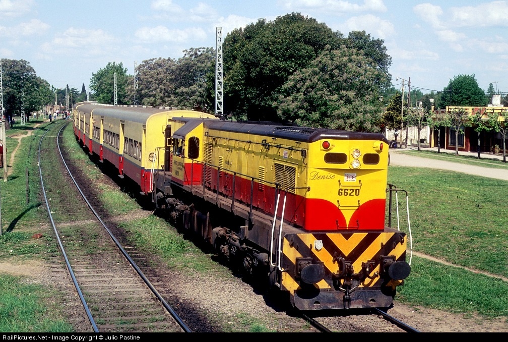 One of Transportes Metropolitanos Roca's commuter trains left Estanislao Zeballos station, in the southern surroundings of Buenos Aires, pulled by FerroExpreso Pampeano's GM-EMD GR12 #6620, lent to help the passenger carrier overcome one of his frequent power shortages.